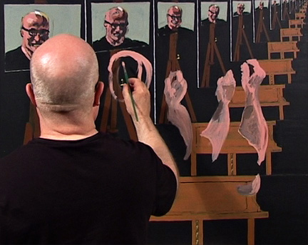 Ian Bourn: “In 2-Mirror Self-Portrait, Version 5 ‘Grimoire’ (2016), I became preoccupied with the ‘hand trying to paint the hand painting itself’. Its ‘book of spells’ title comes from the growing awareness of my ritualized actions, and refers to an older meaning of ‘art’ in which magic is performed with wand/pencil/brush. The ‘artist’ both paints himself into the picture and paints himself out. The end result is a black canvas, whose visual history lies buried under the layers of over-painting.
