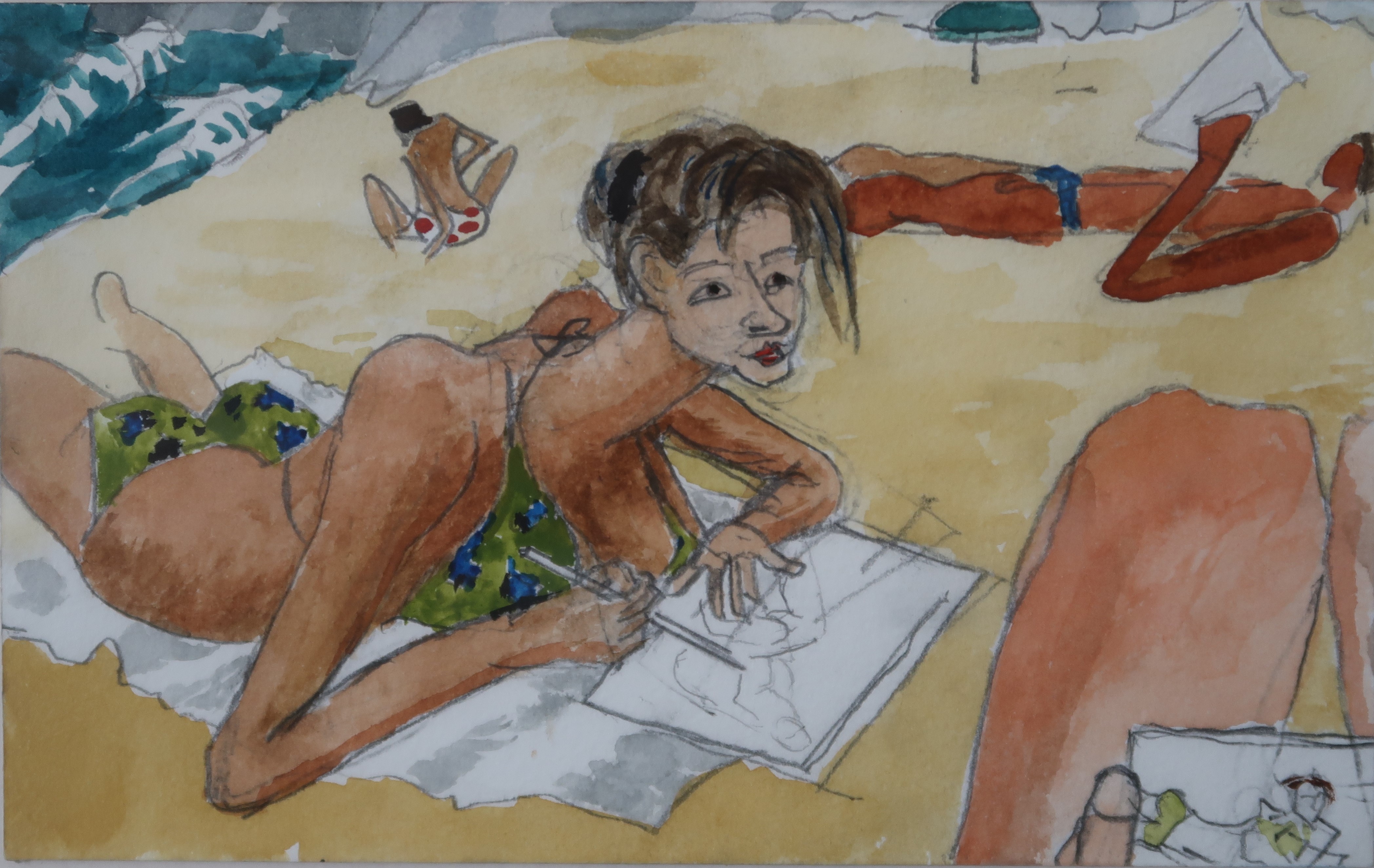 Anthony Howell: “In the early years of this century I went on several trips to lands where more sun was to be found than in the British Isles, including the Costa Verde and Fuerteventura in the Canaries. I became interested in contrasting the vertical pole of the parasol with the curve of the beach and the curves of the body, and this led me to see that my pencil was another vertical which might be used. This in turn prompted me into including my own hand, my own knees etc in the drawing as I sketched. As I did this, I was reminded of the paintings of John Bratby – of the artist painting a picture – which included the hands of the painter.” ANTHONY HOWELL – further images here: https://the-room.org.uk/wp-content/uploads/2021/10/sketching-and-walking-away-reduced.pdf