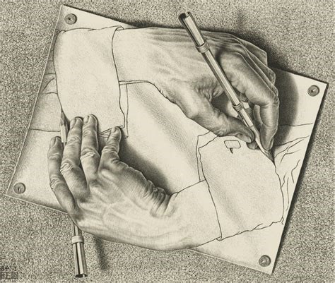 The painter painting a picture of herself is clearly the start of a regressive series. And this can be localised – down to the hand drawing a picture of the hand as it draws the hand, as can be seen in the symmetrical work of M.C. Escher, who deals in graphic conundrums.