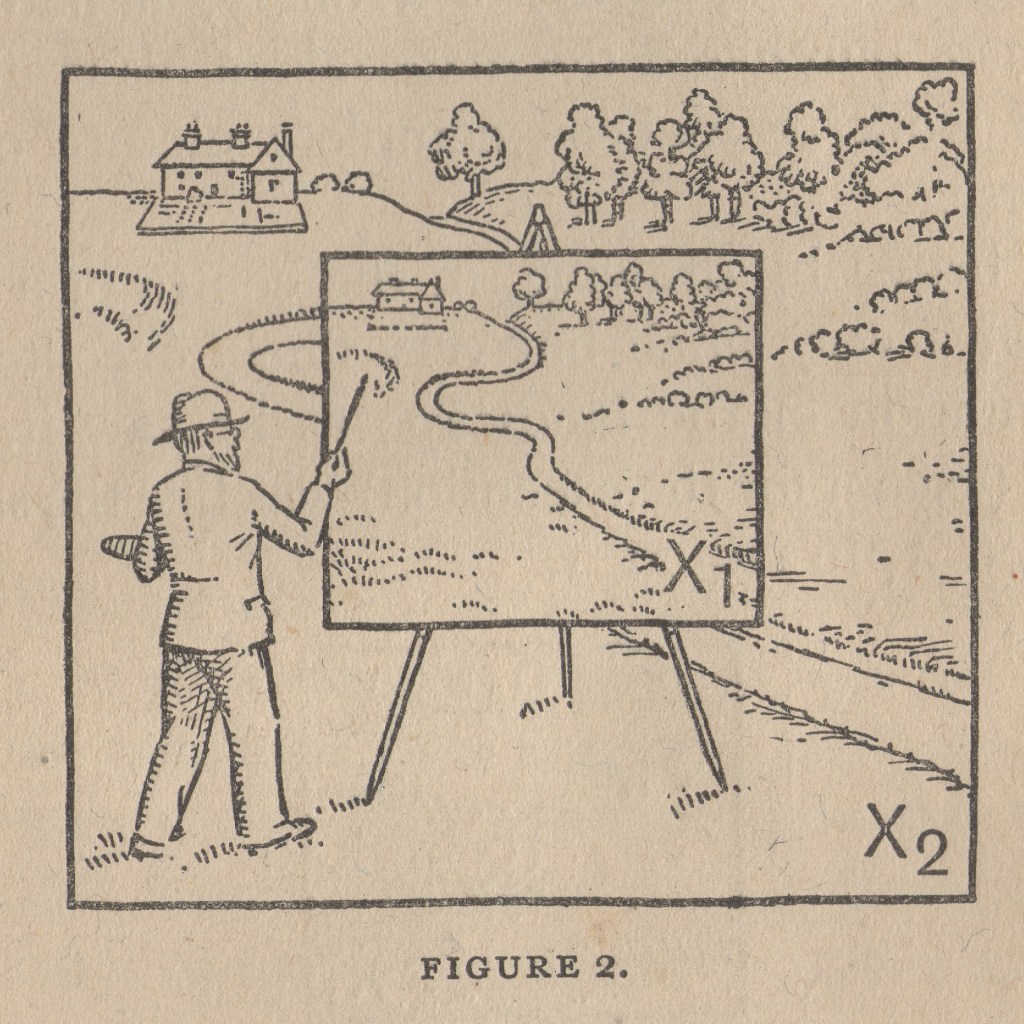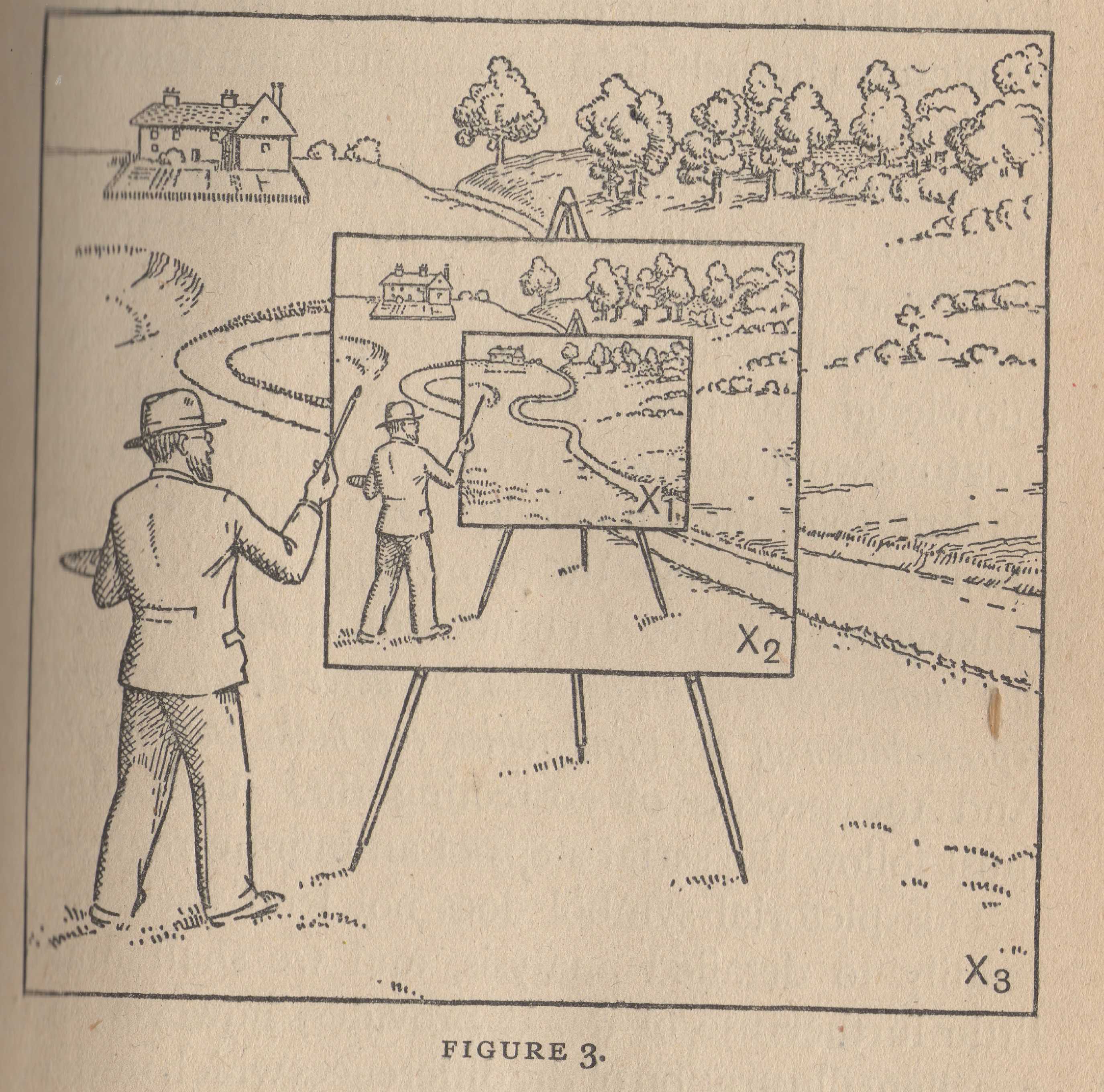 It is stated that Magritte’s painting, The Human Condition, was completed in 1933, but note that, if so, it predates the publication of The Serial Universe by just one year. I don’t buy that. My hunch is that Magritte tweaked the date, in order to lay claim to some originality of concept. But it should be noted that there is a fundamental difference between Dunne’s diagrams and the famous work by Magritte. In the Magritte, no artist is present.