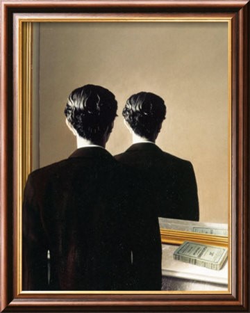 While it influenced writers such as Melville and Verne, the book is essentially one long meander, without the doubling back, or the exploring of implications of earlier actions on outcomes, which distinguishes most tightly-plotted works. Life is not constructed as farce or a tragedy. Basically a book like this, it’s not even picaresque, it just describes one damn thing after another. So why is it there – in La reproduction interdite? What role has it to play in what might be called a tightly-plotted painting that emphatically refers back to itself? It’s my view that the book represents the painting’s antithesis, and by placing it in the painting, Magritte’s work achieves that marriage of thesis and antithesis which is considered synthesis.