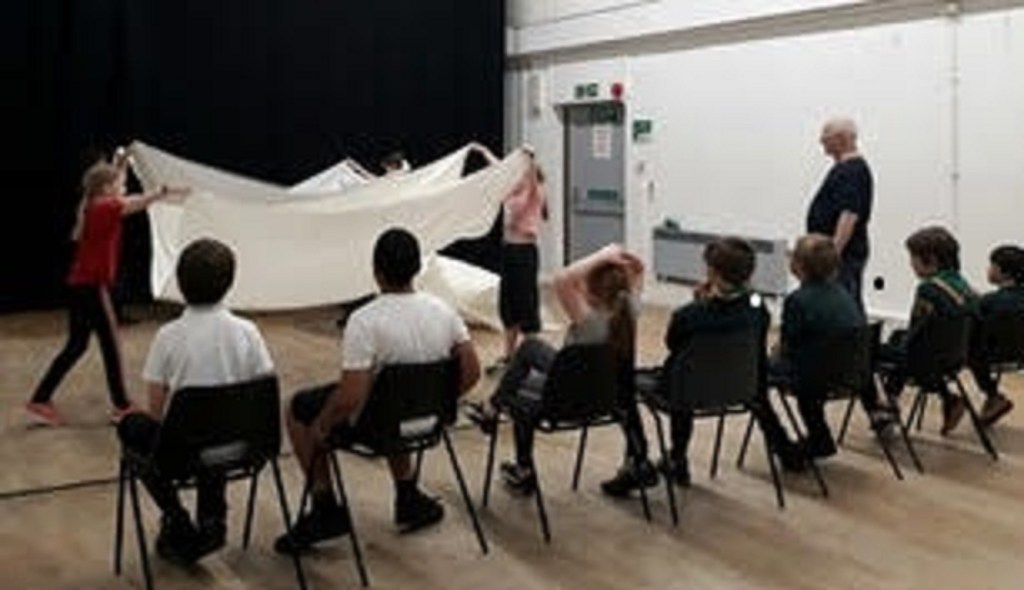 Share the shake of the sheet, one of you at each short end. Rotate your sheet on the spot with a sheet shared like this with a partner – which could be interesting done increasingly fast or slow. Then really slow the action down to doing it so slowly no one can see you moving.