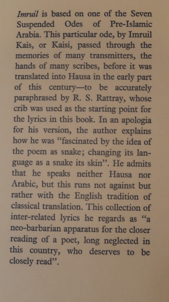 Imruil – A naturalized version of his ode-book – one of the seven ‘suspended odes’ of pre-Islamic Arabia – came out in 1970 from Barrie & Jenkins, whose editor at the time was Christopher Maclehose.