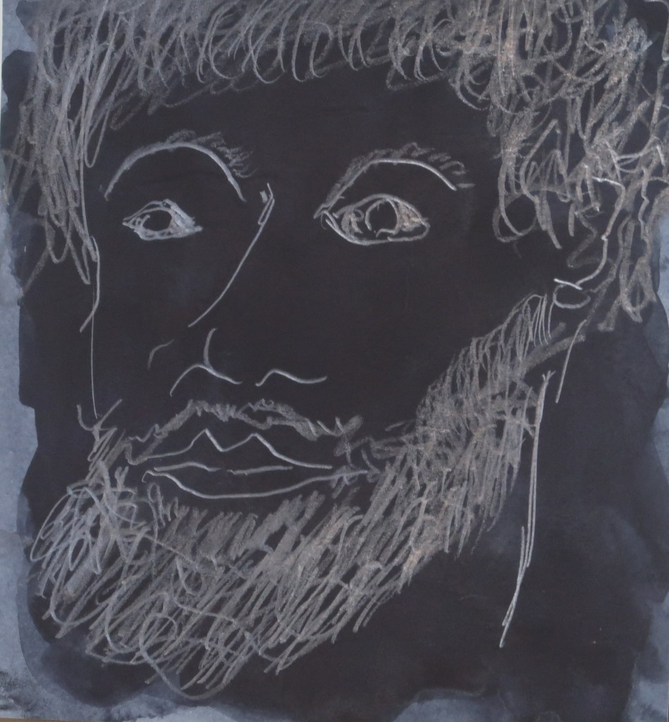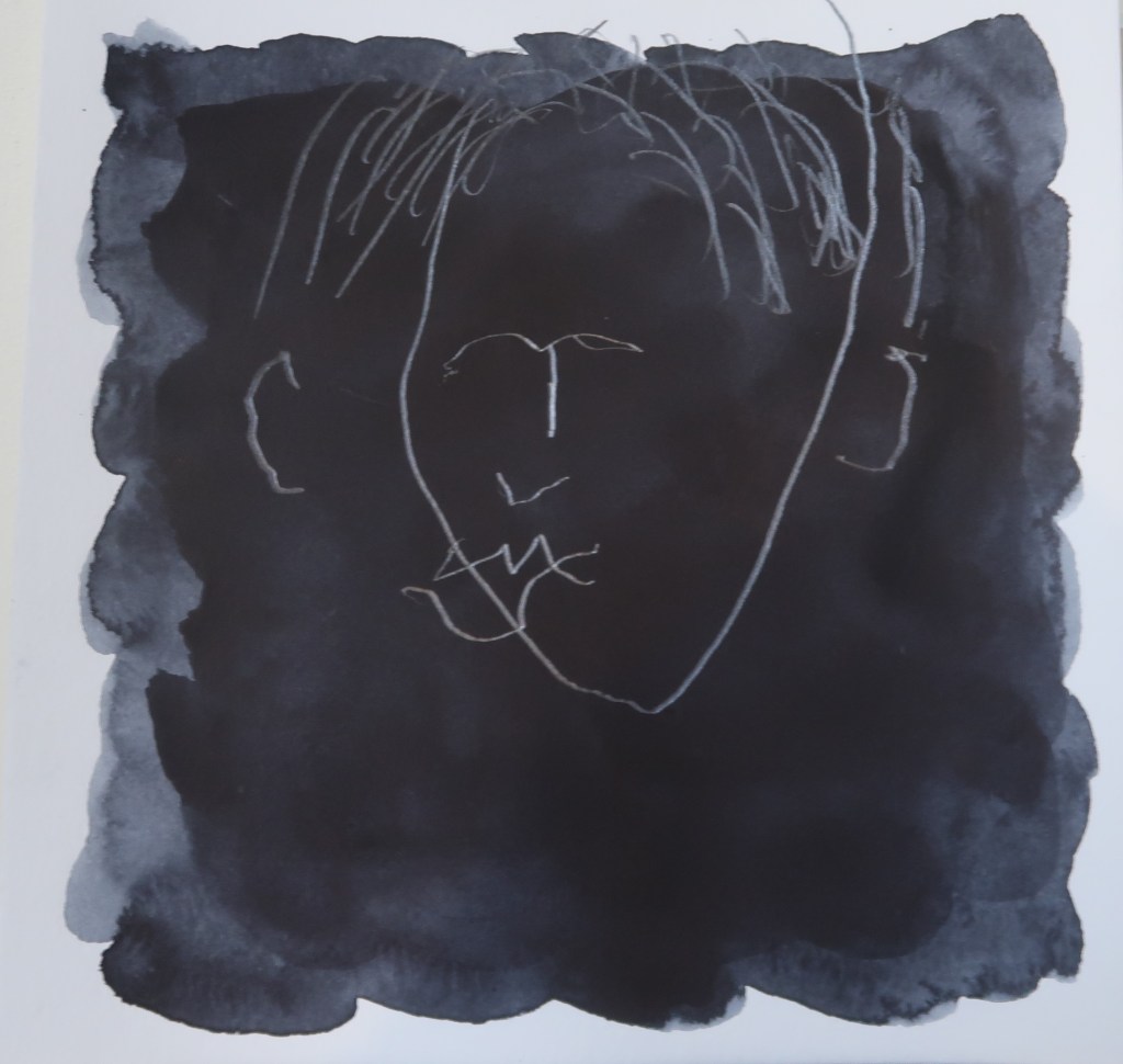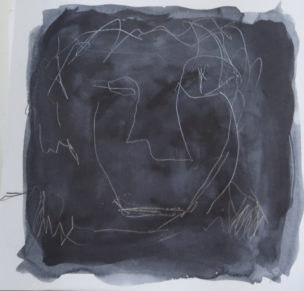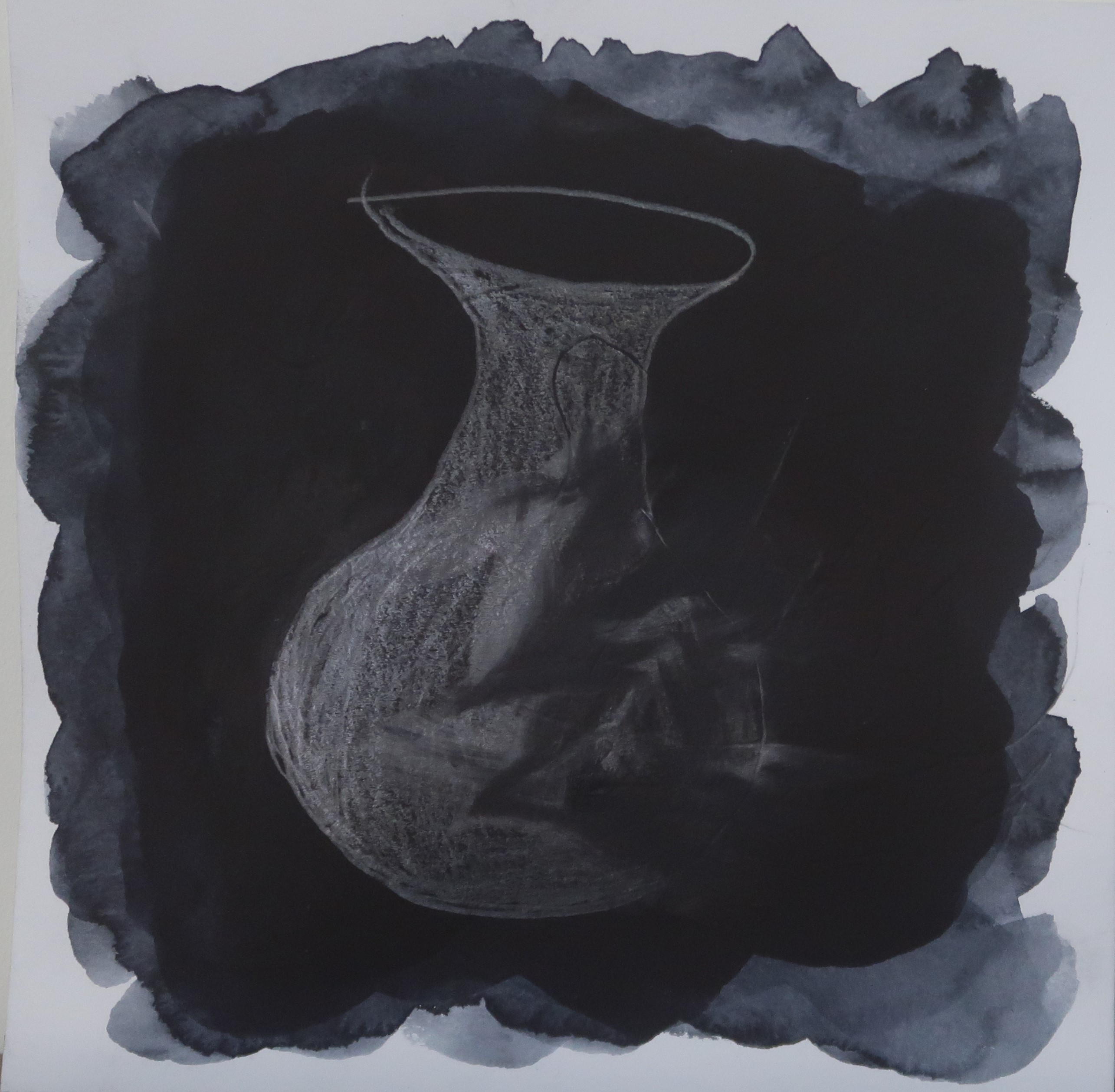 Several drawings done with the eyes closed. Erasure on vases done with the eyes closed.