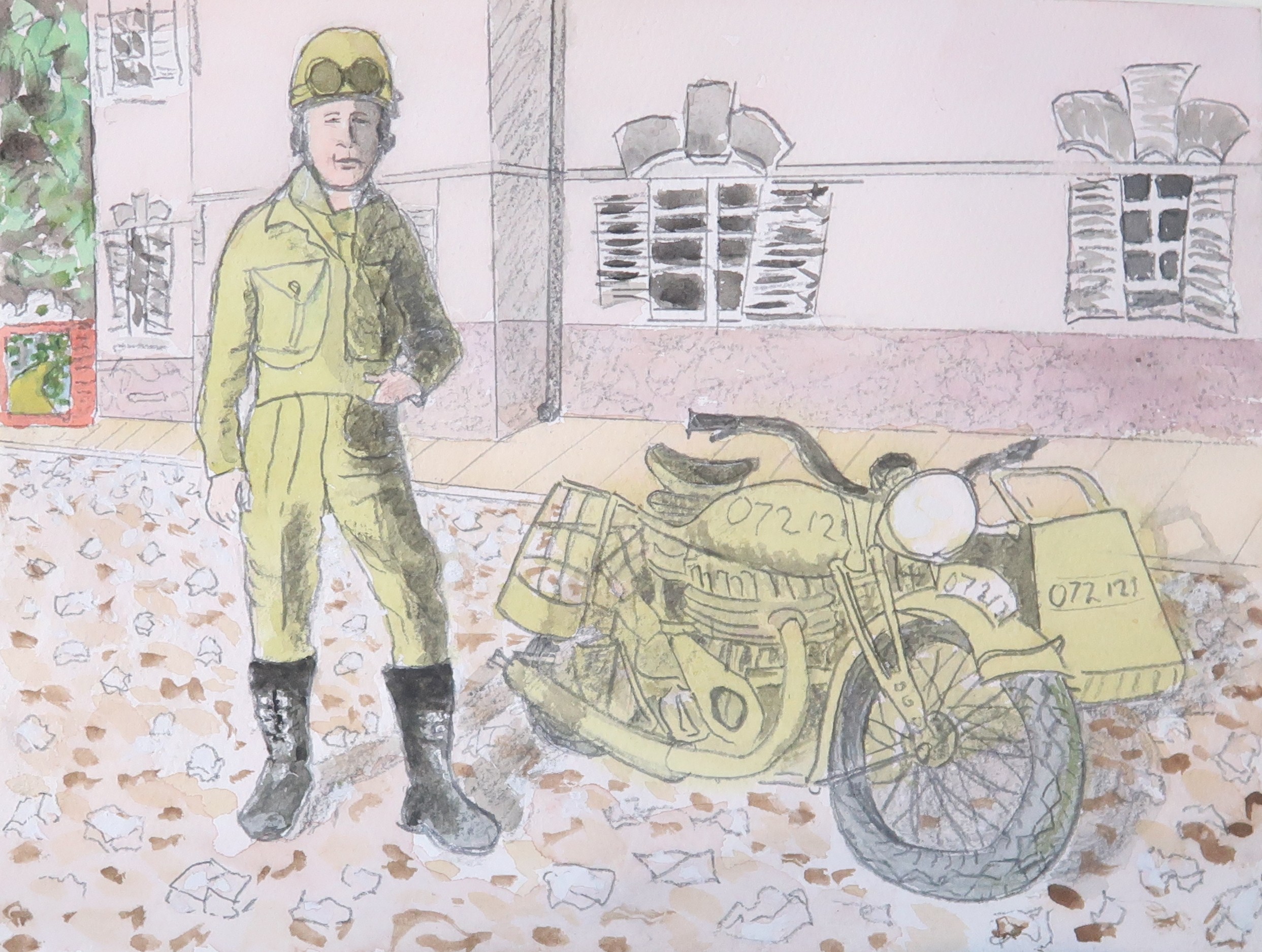 He was very proud of his bike with its side-car and travelled on it into Naples from the camp where he was stationed to go to the Scala, having fallen in love with Italian Opera. Bikes with sidecars were notoriously dangerous. In Naples, most officers issued them died on them. My father was no exception. Bear in mind one was riding through traffic in a country one was occupying, so most truck drivers had been enemy combatants until a few months before. My father was squashed between two lorries. I was born a few weeks later. I used to love watching the zoetrope he had made out of a biscuit-tin, especially one animation of a naked girl walking towards one.